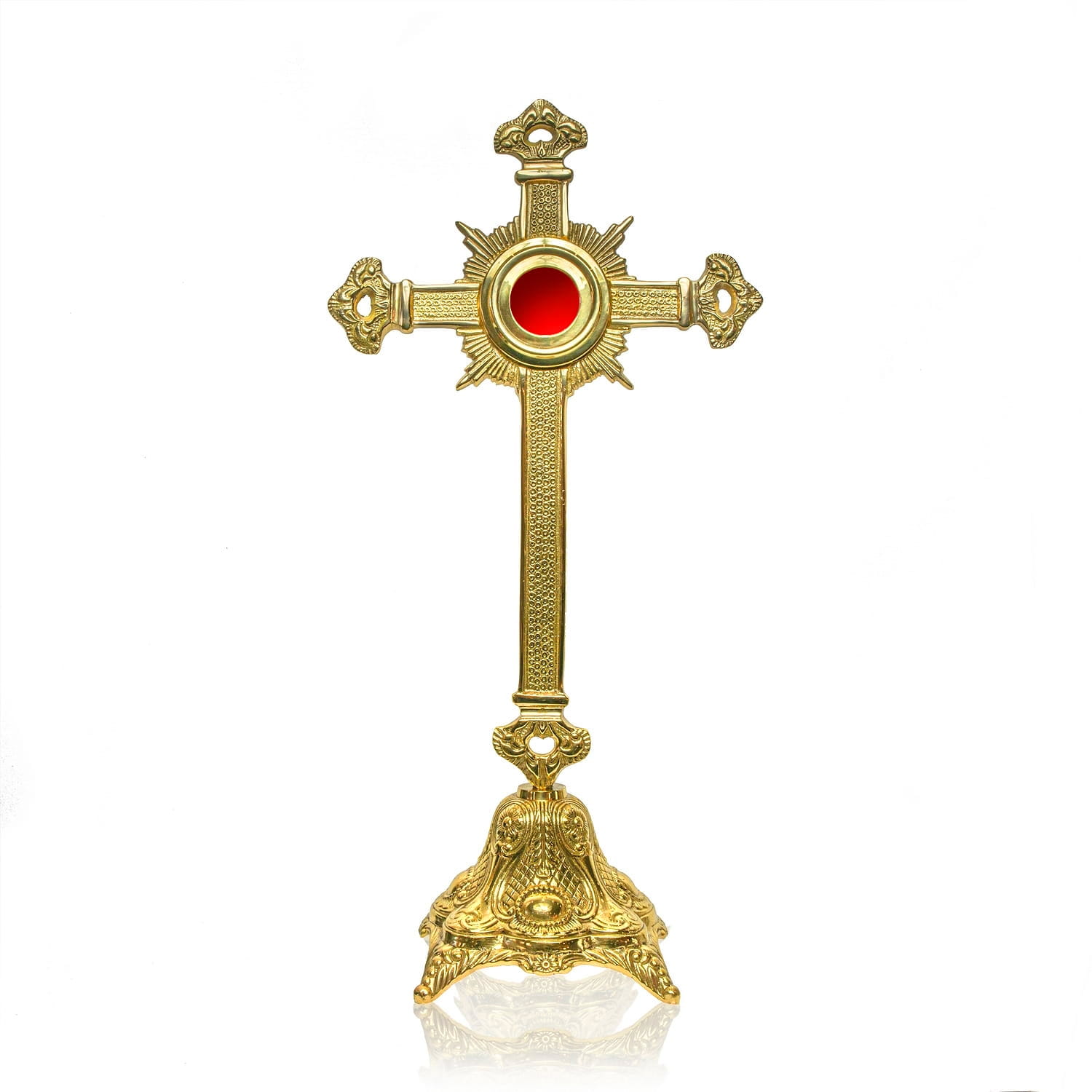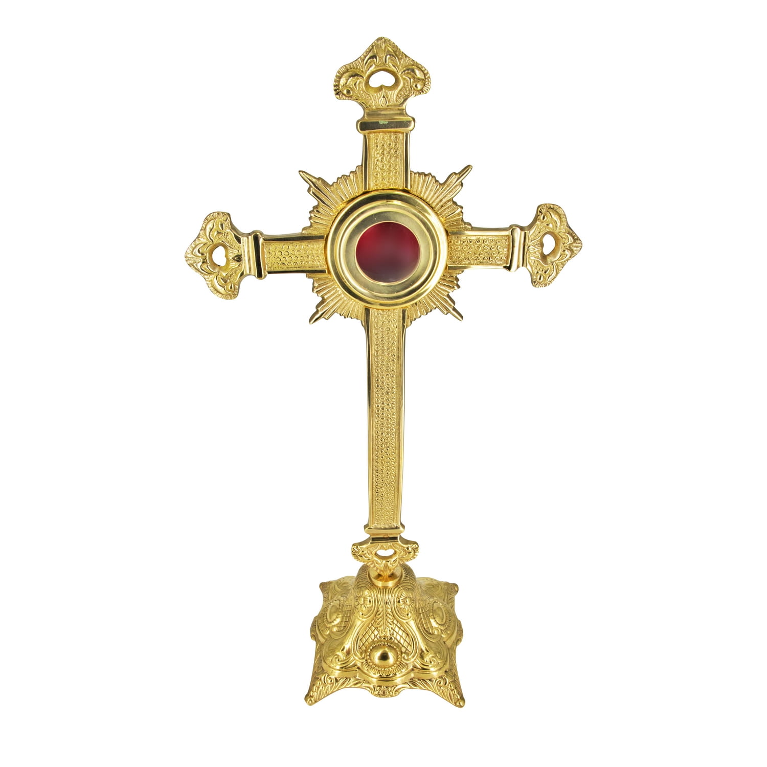Un reliquaire en laiton richement décoré avec une croix